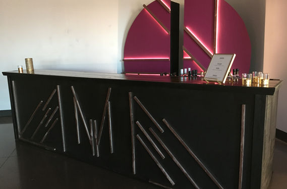 White elegant angled bar with 3 mirror faces. Recessed serving shelf for bartending ease.